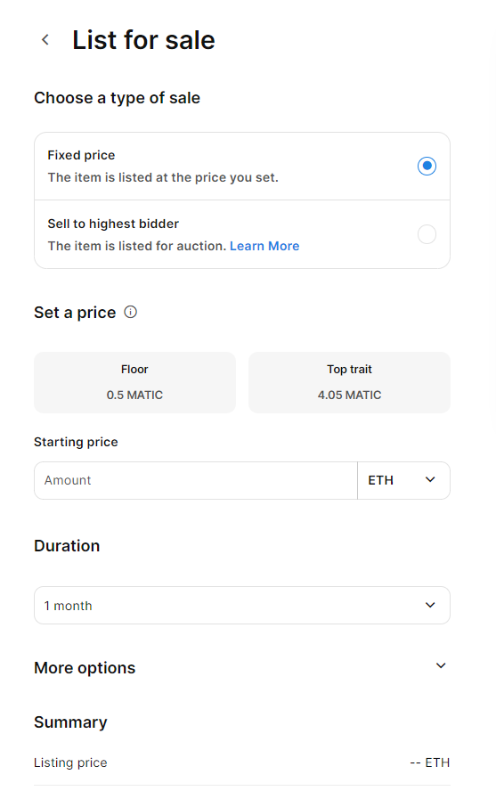 - Specify the sale details, including whether it's an auction or fixed price, the price in Polygon, and other relevant details.